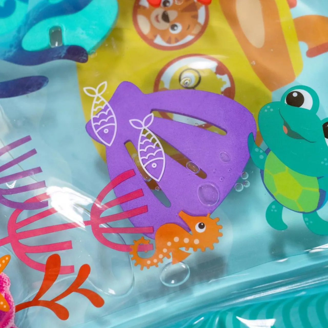- Ocean-themed, tummy time mat engages baby’s senses through mess-free water play and encourages fine motor skill development as baby bats or pushes 3 floating creatures.