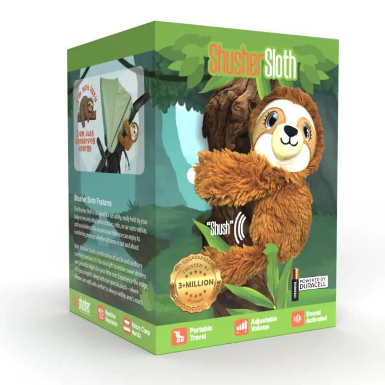 DetailsYour baby can hold Shusher Sloth or hang on the pram or cotComes with 2 AA Duracell BatteriesNoise ActivatedAdjus…