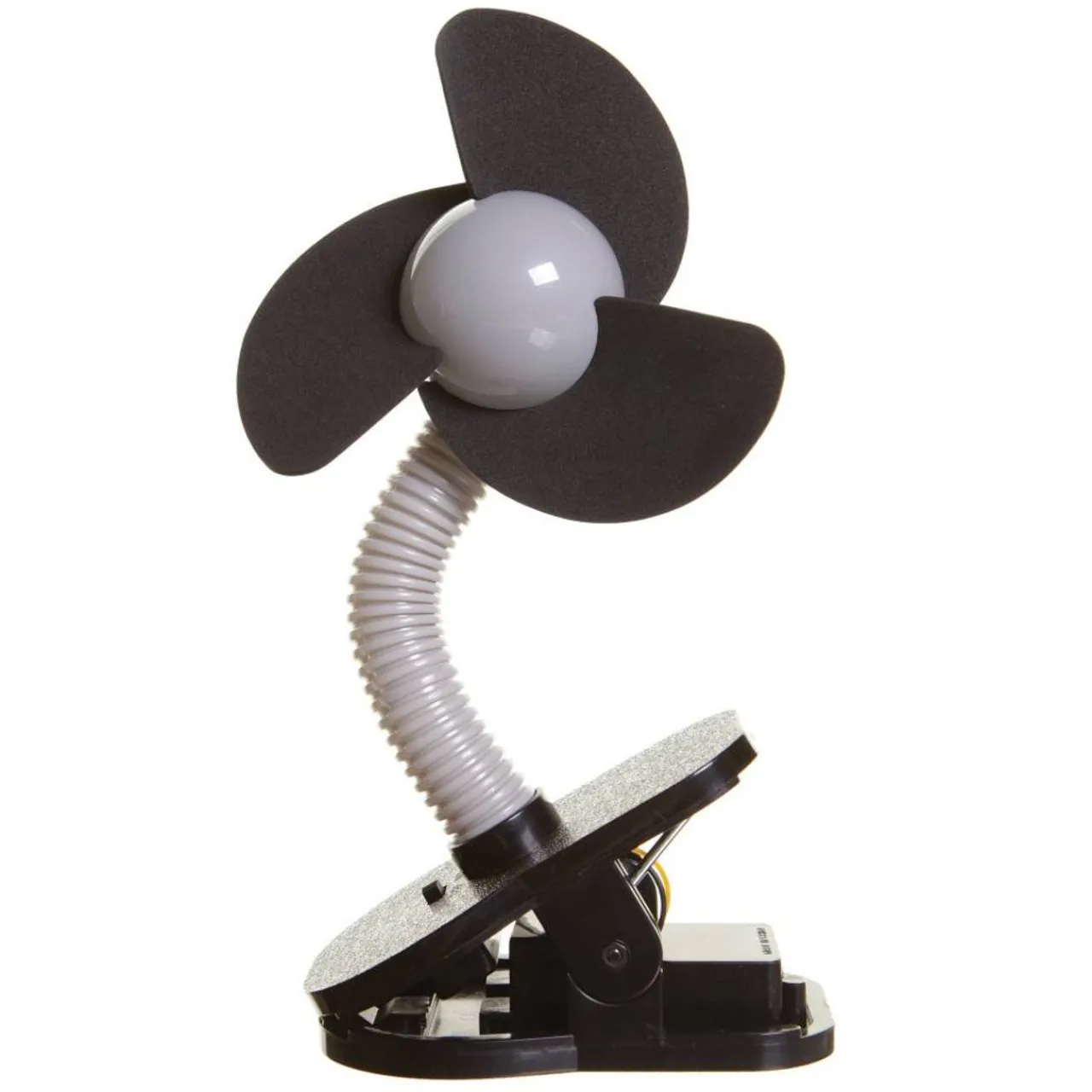 The fan easily attaches with a large clip (big enough for strollers or the side rail of a cot). The fan has a flexible neck, so you can adjust it into the right position.