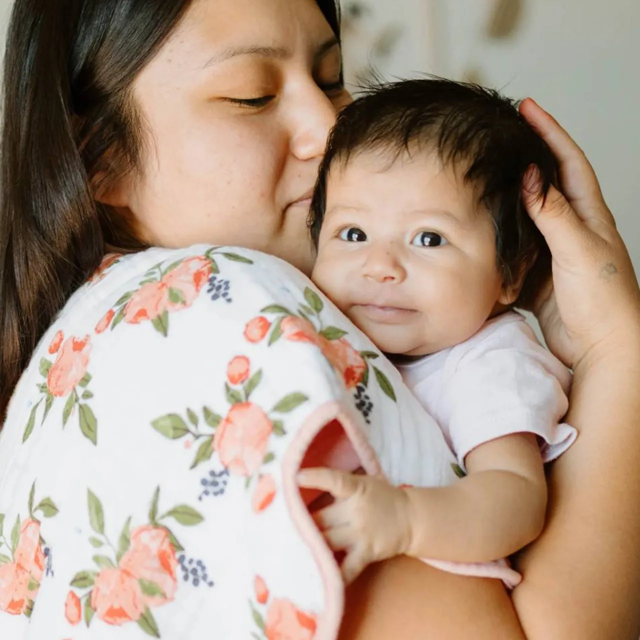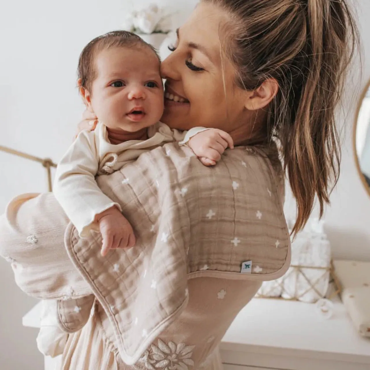 A beautiful Cotton Muslin Burp Cloth from Little Unicorn, featuring four quilted layers of cotton muslin with an innovative shape for a superior fit.