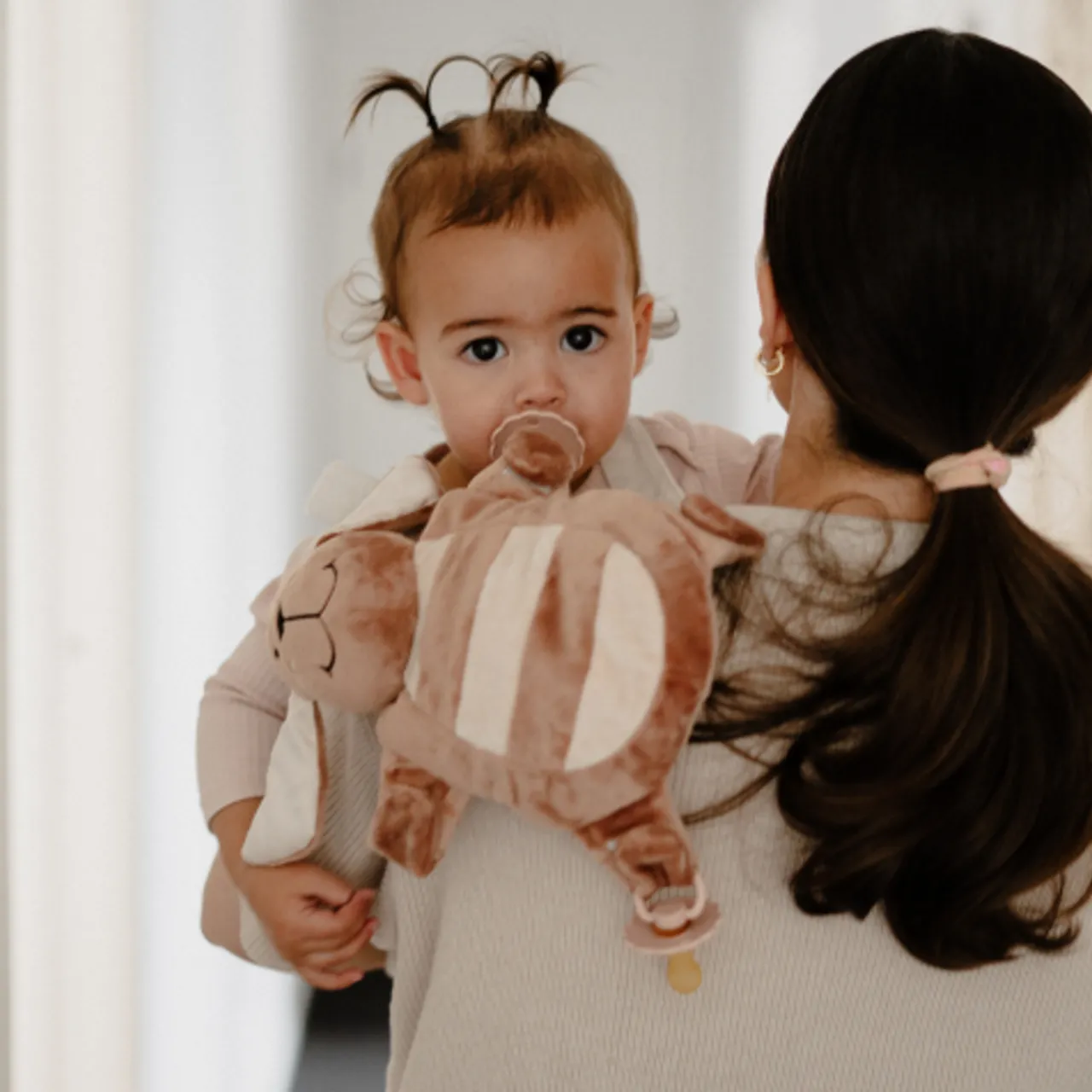 Simply open the paws and attach a soother or teether and close the paws again! Perfect for older babies and toddlers.