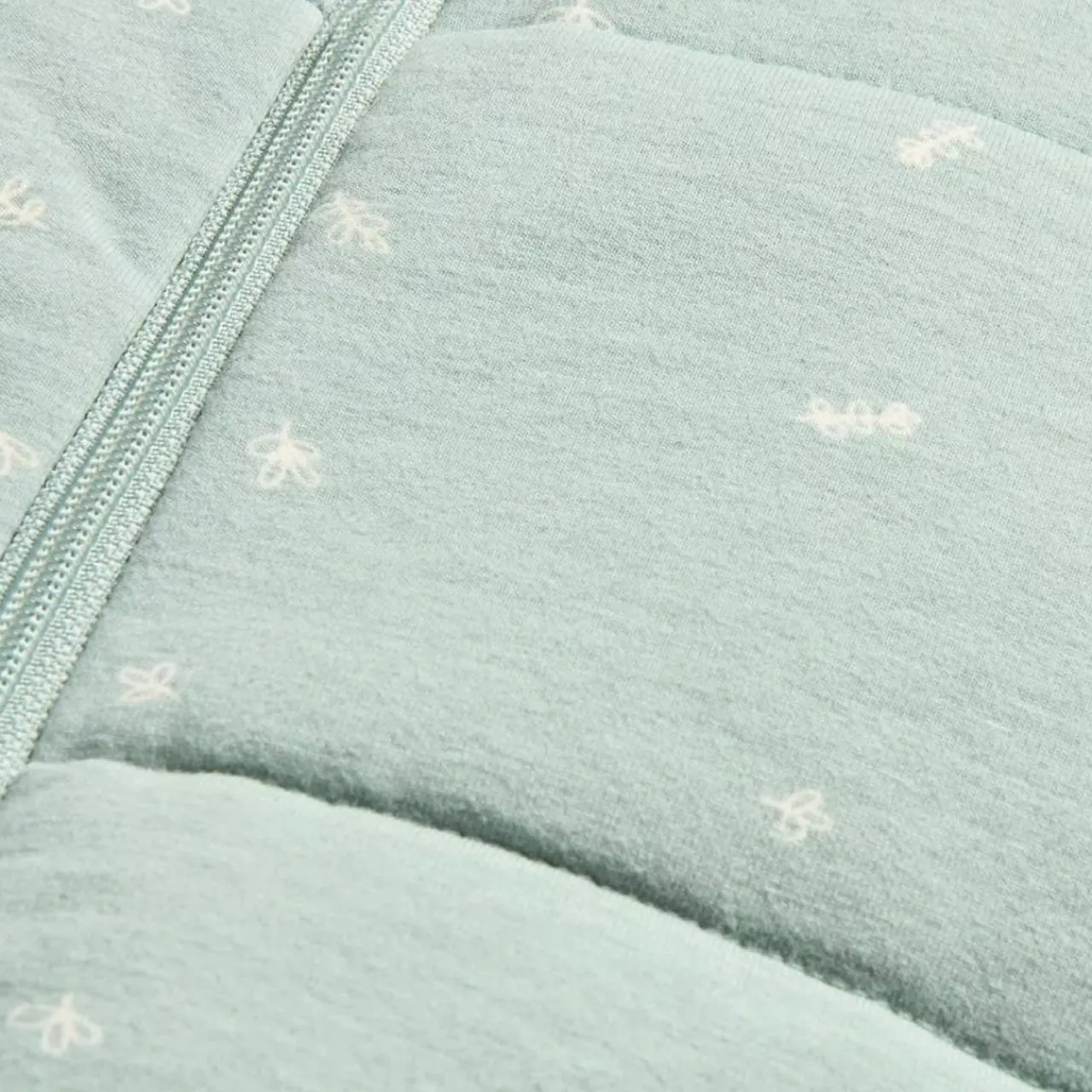The top swaddle section is 1.0 tog stretch cotton, and the bottom half is a 2.5 tog sleeping bag filled with pure organic cotton for maximum breathability and softness.