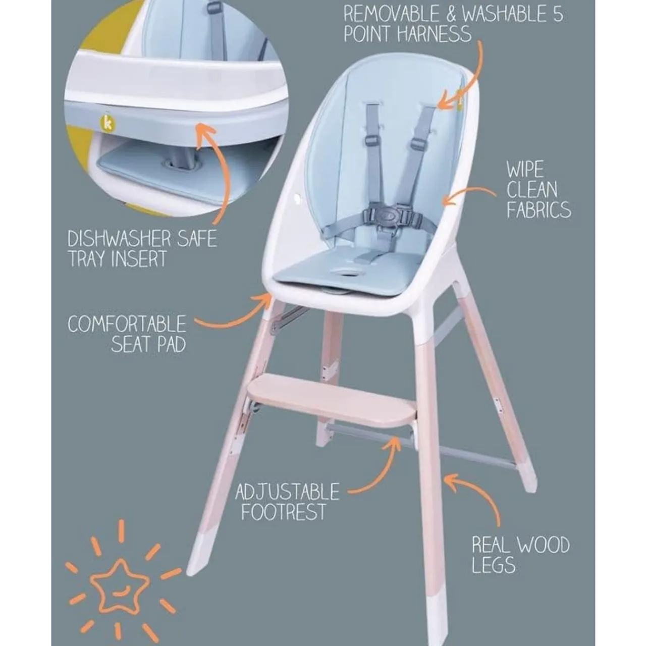 - Easy wipe-clean fabrics & dishwasher safe tray