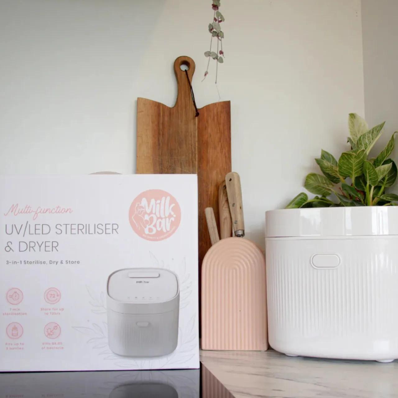 - Sterilises and dries bottles, breast pump parts, pacifiers and more