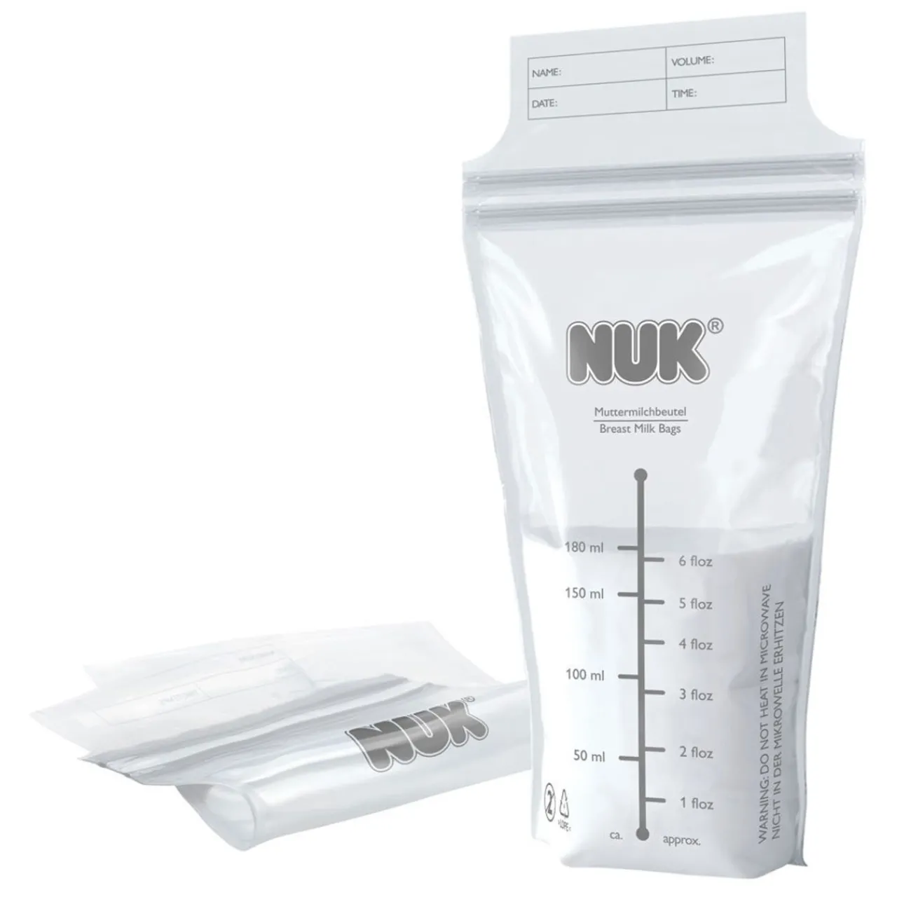 Thanks to the double-seal the bags are leak-proof. The bags can be clearly arranged either in the refrigerator or freezer in order to save space. Due to the flexible material they can be easily stacked one above the other. When lying flat NUK Breast Milk Bags have a larger surface area than breast milk containers, allowing faster freezing and easier thawing. By fast freezing, the natural ageing process of breast milk is slowed down, the precious milk thus retaining its valuable ingredients.
